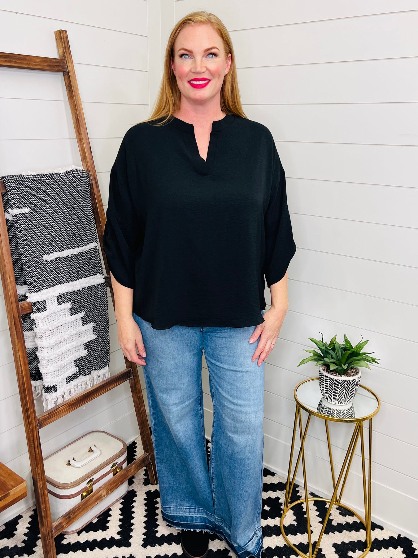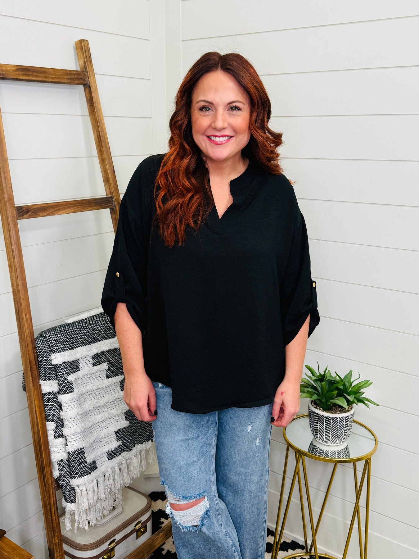 This notched black woven top adds a playful twist to your wardrobe with its chic v neckline and stylish sleeve button detail. Perfectly tailored for work or an elevated casual vibe, it pairs effortlessly with your favorite jeans for an easygoing yet polished look. Step out in confidence, whether you're tackling meetings or weekend plans!