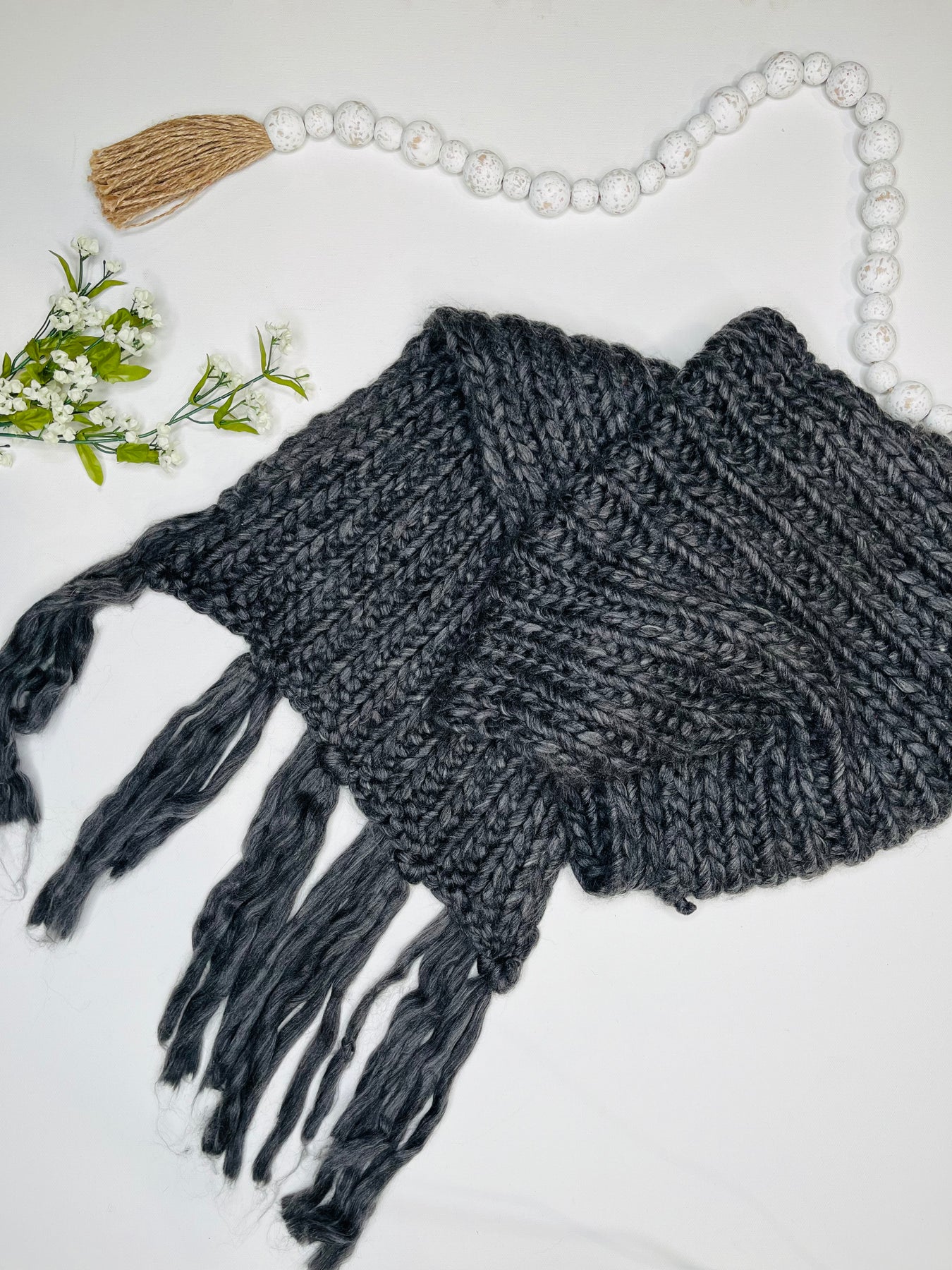 Indulge in the luxurious softness of our hand made Charcoal Chunky Knit Fringe Scarf. The oversized design and chunky knit create a sense of opulent warmth, while the versatile charcoal grey color effortlessly complements any outfit. Elevate your winter wardrobe with this elegant and sophisticated accessory.