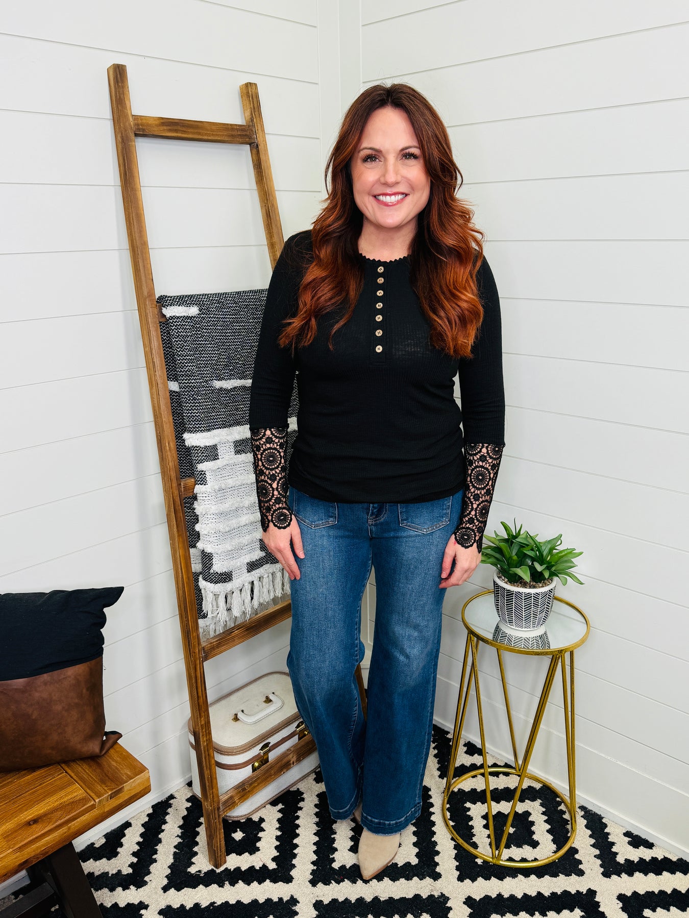 The perfect combo of style, comfort and versatility!! This ribbed Henley button front top with crochet lace sleeve detail is next level amazing! Wear alone or layer it’s a closet must have that’s anything BUT boring!