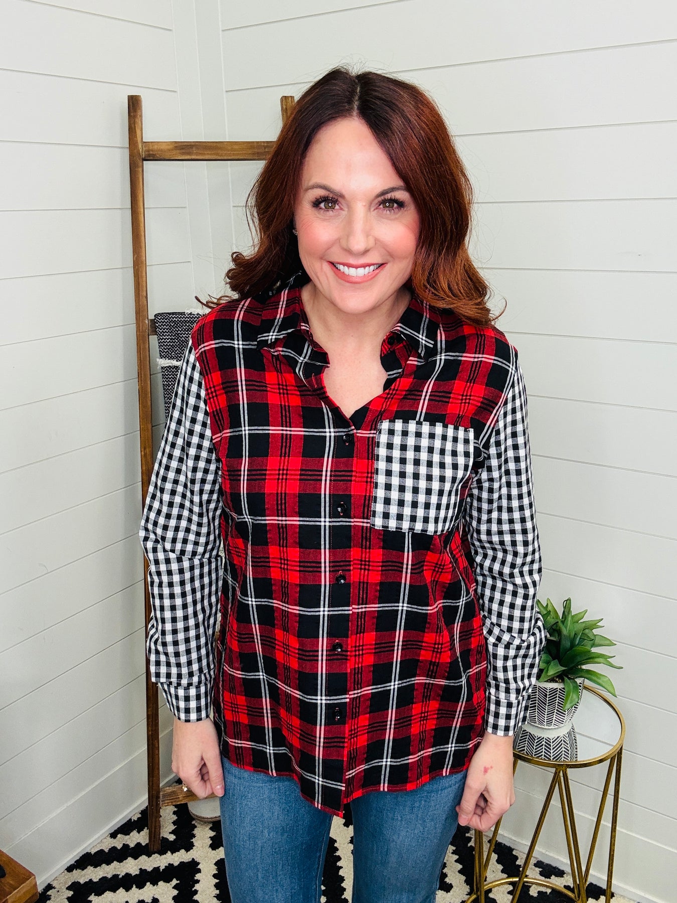 This mixed plaid button up features a classic black and white design with a pop of red, adding a versatile touch to any wardrobe. Made with durable buttons and comfortable fabric, this shirt is perfect for any occasion. Upgrade your style with this timeless and trendy plaid button up.
