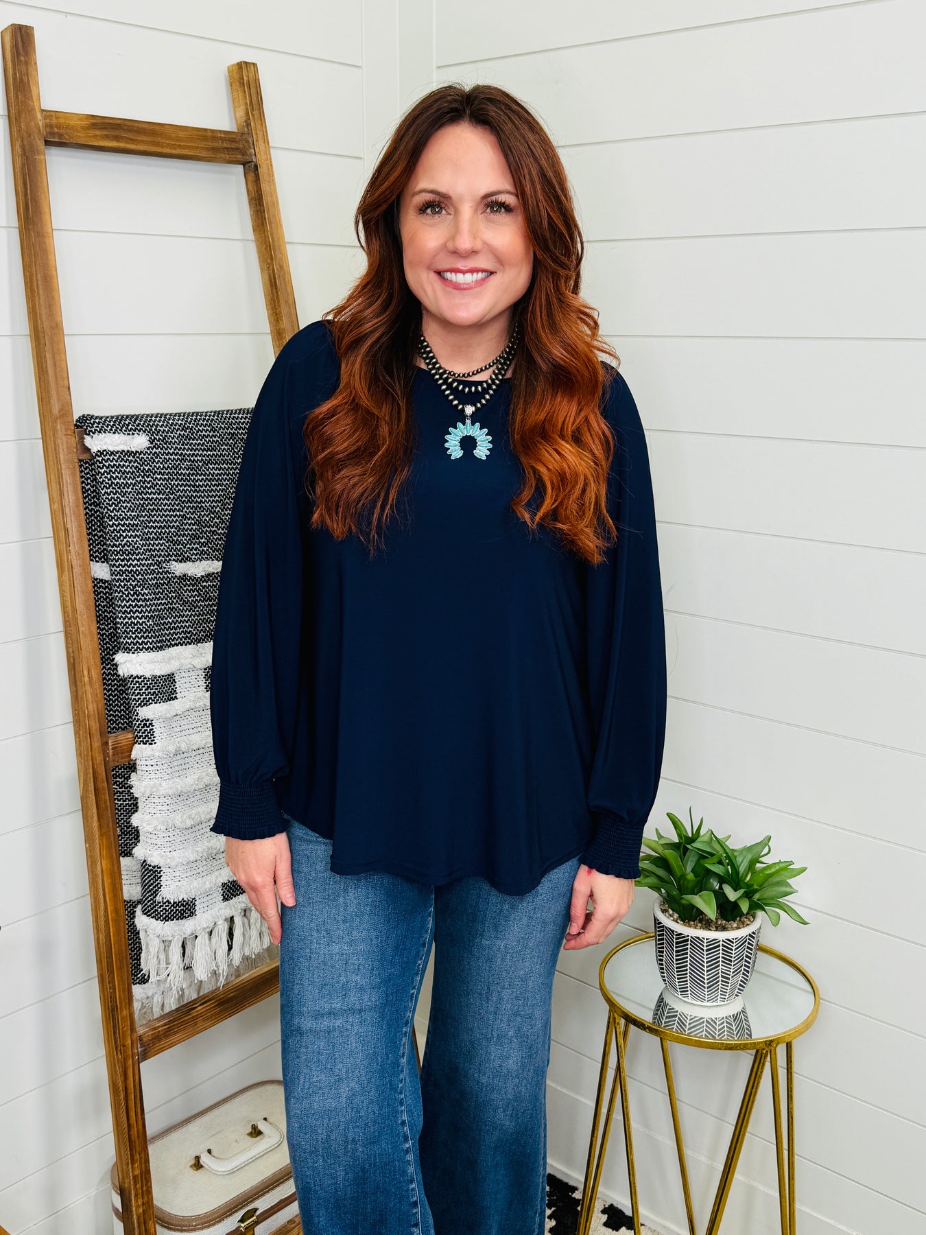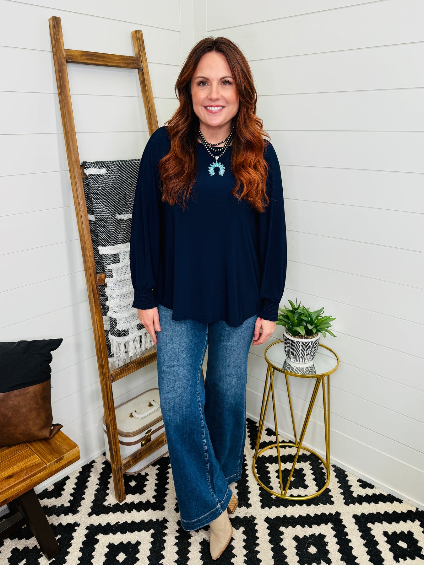 This Navy Smocked Sleeve Tunic embodies understated elegance with its rich, versatile color and thoughtfully designed silhouette. The flowing fabric drapes beautifully to complement your natural shape, while intricate smocked sleeves elevate the overall aesthetic with refined craftsmanship. Whether you're dressing up for an important event or seeking a polished everyday piece, this tunic delivers both style and comfort. You'll appreciate how easily it pairs with your existing wardrobe while making you feel confident and put-together.