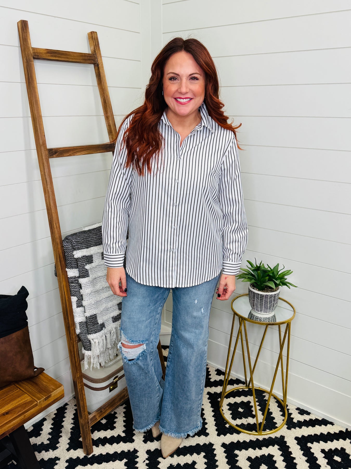 Step up your style game with this menswear-inspired charcoal pinstripe button-up. Classic yet effortlessly chic, it adds a touch of tailored cool to any outfit. Perfect for those who love a sharp look with a playful edge!