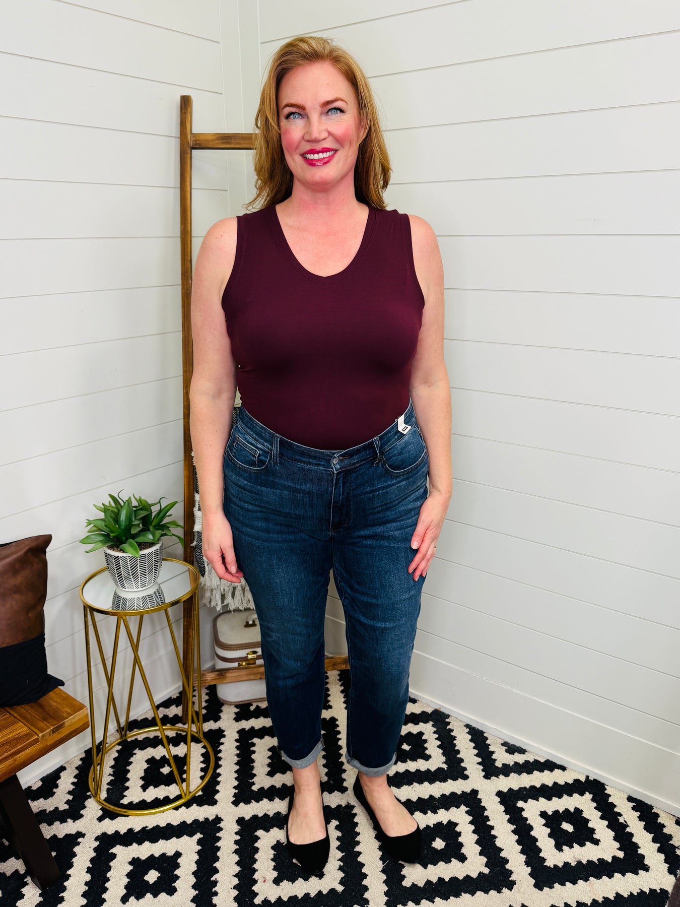 Experience all-day comfort with this butter-soft burgundy bodysuit. Featuring a flattering V-neck and wide straps, it offers a smooth, sleeveless fit that makes an ideal base layer for any outfit. Perfect for layering this season, it combines style and comfort effortlessly.