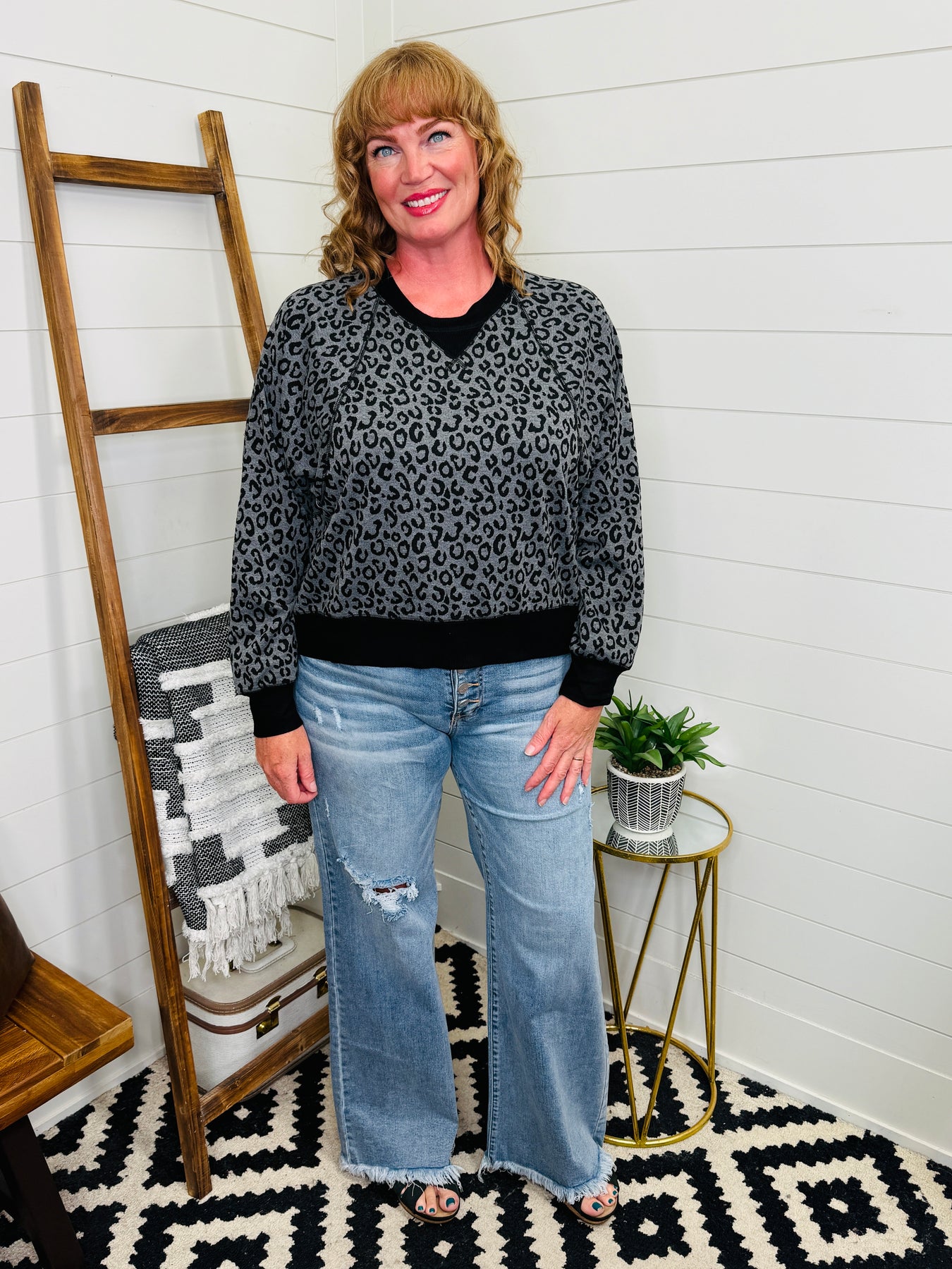 This grey and black leopard drop shoulder crewneck is your new go-to for effortless cool. Featuring relaxed fit and black trim, it blends comfort with casual style. Perfect for laid-back days when you want to look effortlessly playful and chic.