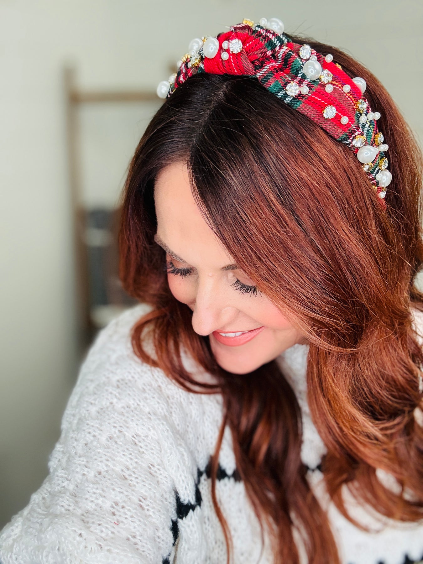 Add a touch of sparkle and style to your ensemble with our Plaid Rhinestone Headband. This cozy knit headband features a bold red plaid design, accented with elegant pearls and sparkling rhinestones.
