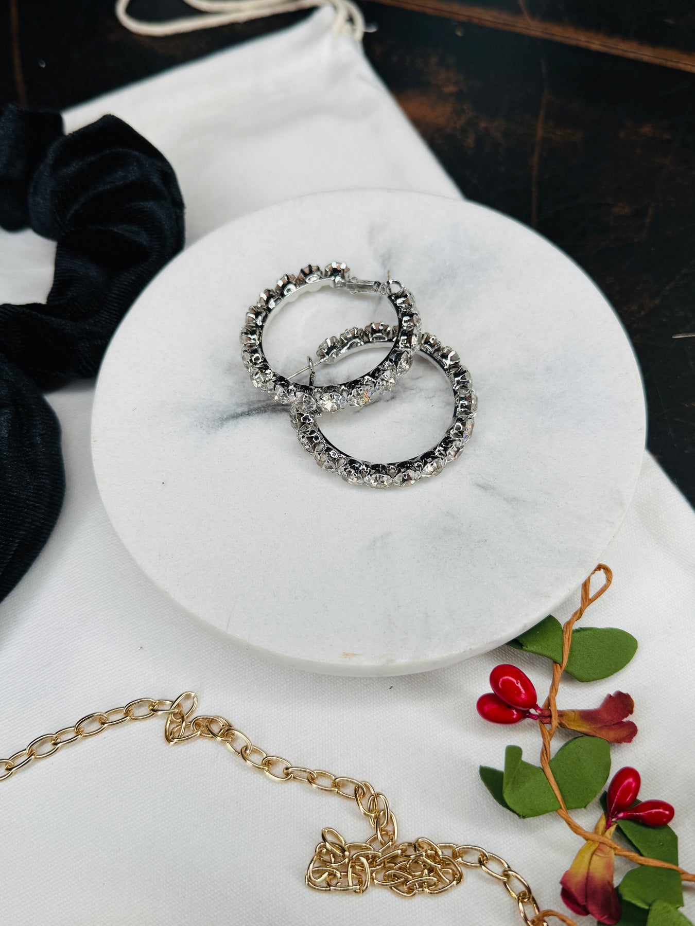 Ready for a fun night out or have big new years plans and need great accessories? We got you covered with this amazing gift bundle! Featuring our sequin clutch, rhinestone hoops and our velvet bow scrunchie.