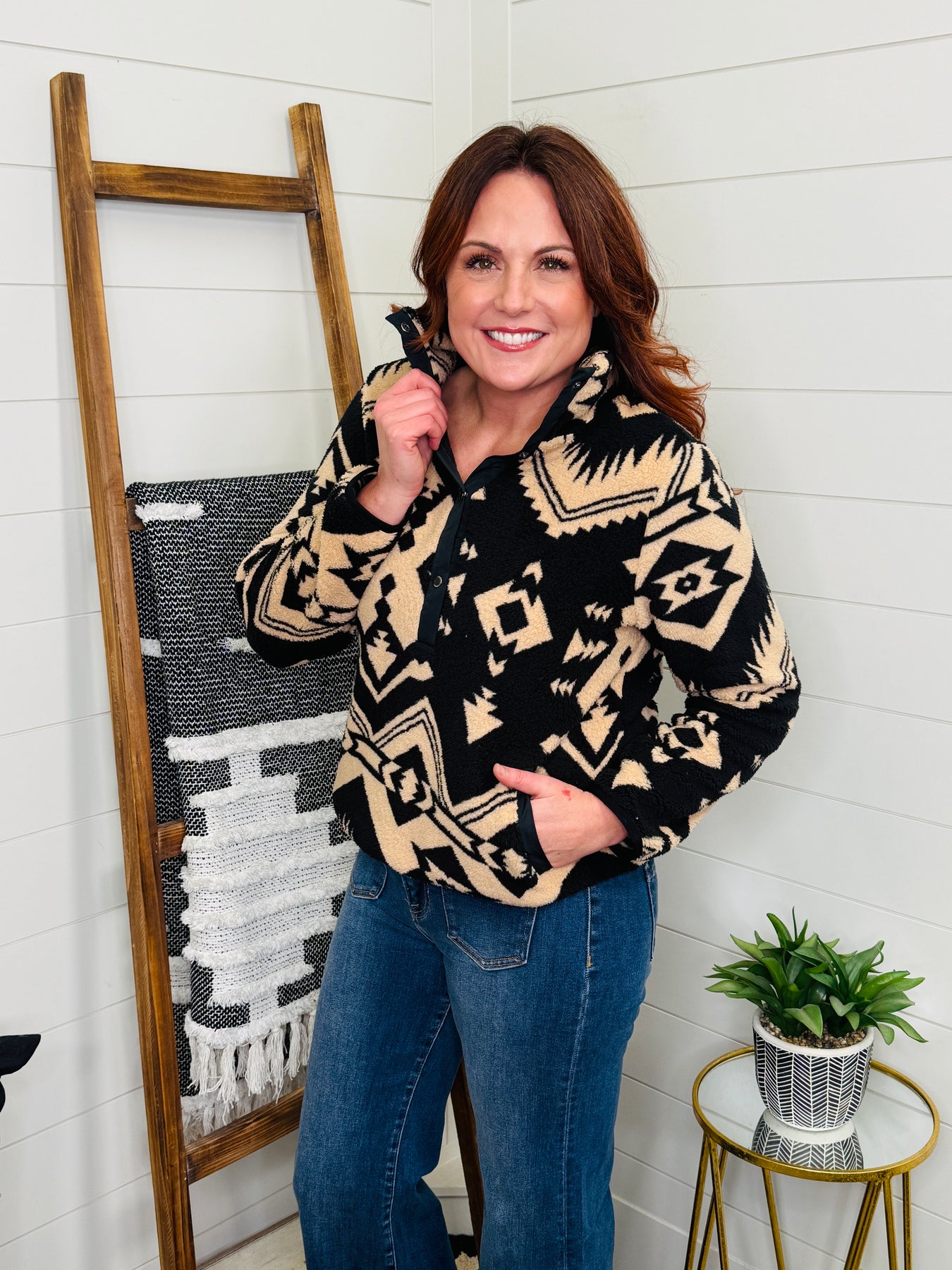 Wrap yourself in effortless style with this Western Aztec Half Front Snap Fleece Pullover. Featuring timeless neutral tones and striking geometric details, it's the perfect piece to elevate your casual denim while keeping you cozy all day long. The soft fleece construction provides warmth without bulk, making it ideal for layering or wearing solo. Available in two versatile colorways, this pullover seamlessly transitions from weekend errands to relaxed gatherings. Comfort meets contemporary design—the must-have staple that makes getting dressed feel like a breeze.