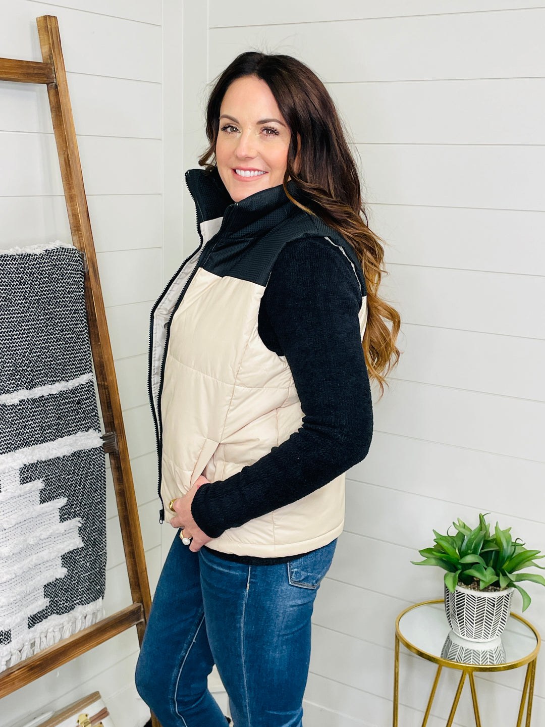 The fit, the fabric this custom piece is PERFECTION friends! You get the shape we know and love from a good puffer vest, but the mix of the black and cream make a statement neutral piece that we know you'll get a ton of good out of... PLUS the top black section has a textured fabric that elevated the piece and makes it extra special!